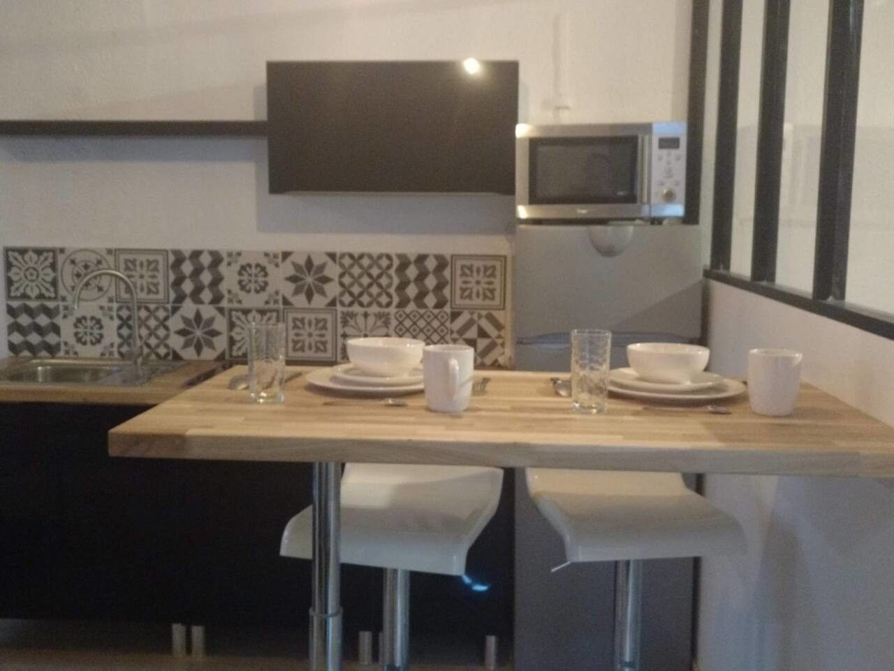 - Una zona de cocina adyacente está equipada con todo lo necesario, nevera, placa de cocción, microondas multifunción, así como toda la vajilla y el equipo de cocina.