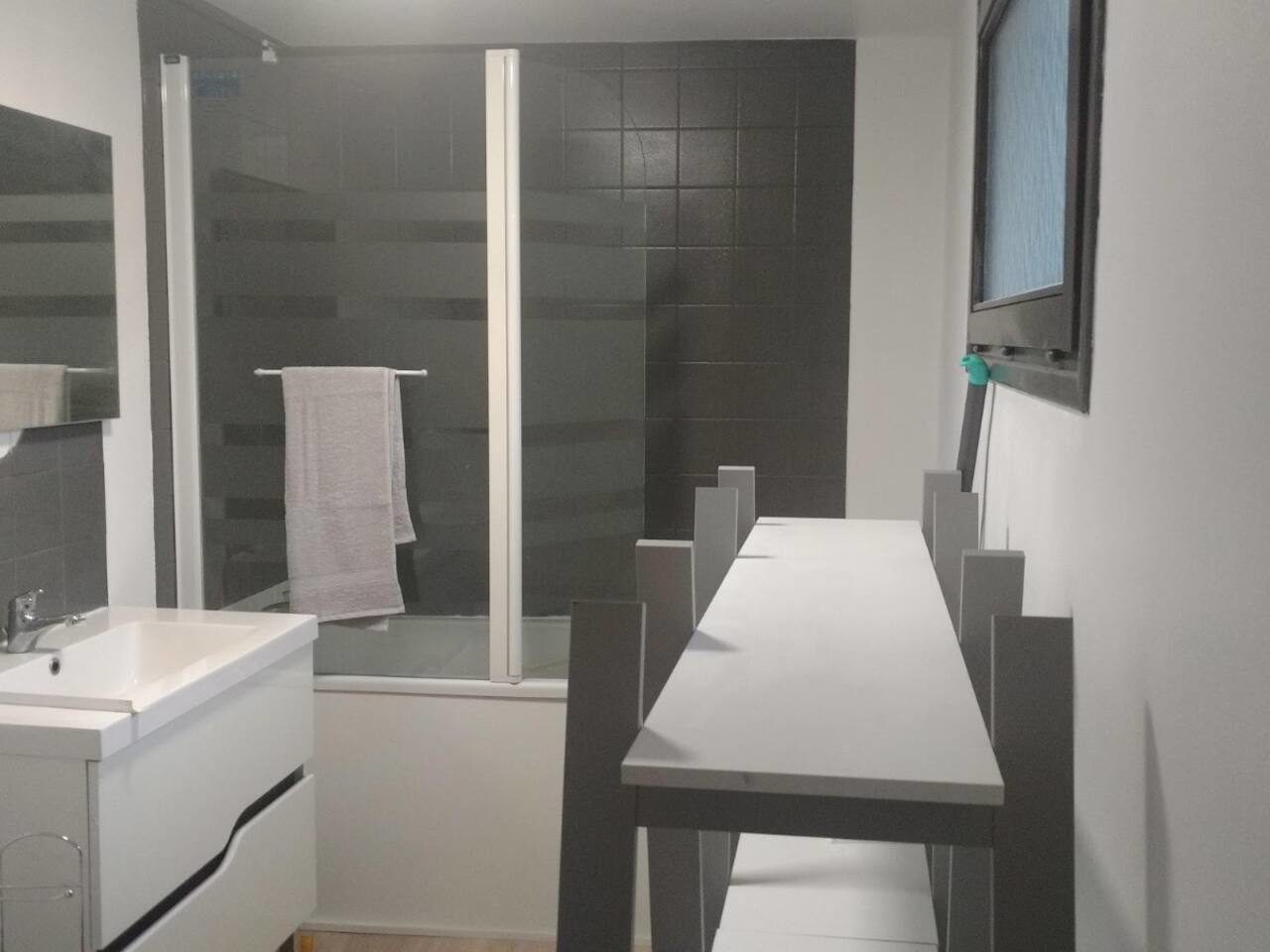 - Un cuarto de baño con ducha, un lavabo con toallas proporcionadas y WC.